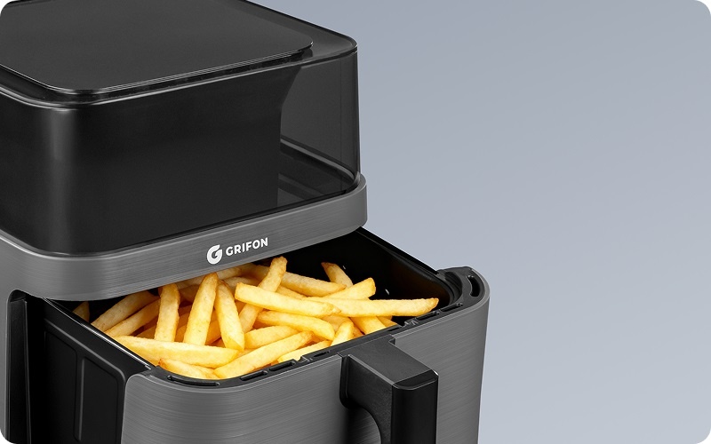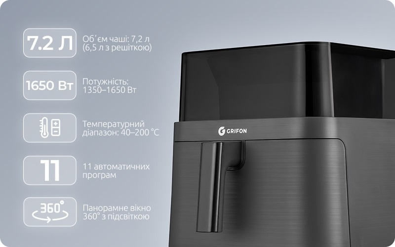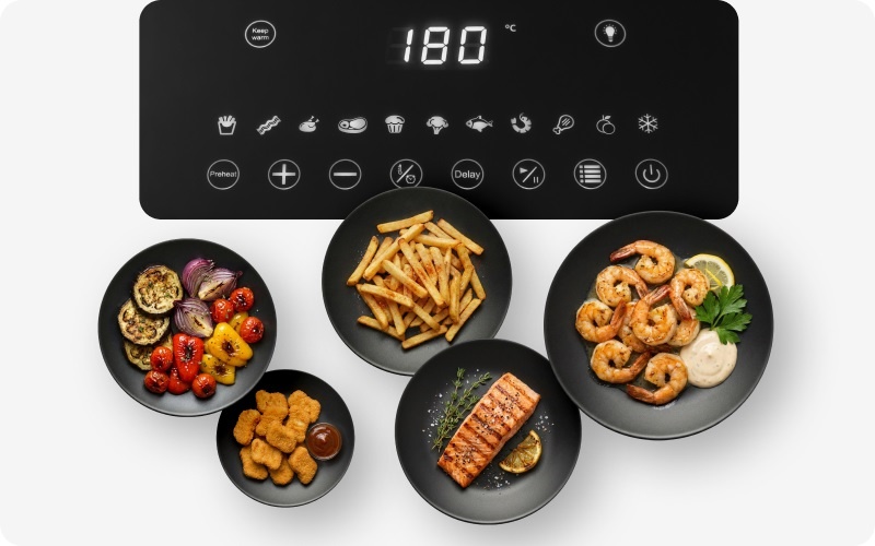 Легке керування та 11 програм для щоденного меню: картопля фрі, бекон, ціла курка, стейк, запіканки, овочі, риба, креветки, курячі ніжки, сухофрукти та розморожування.